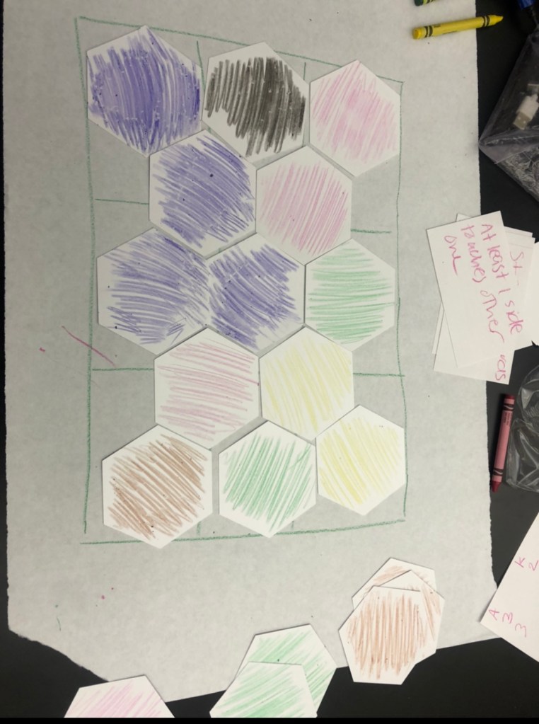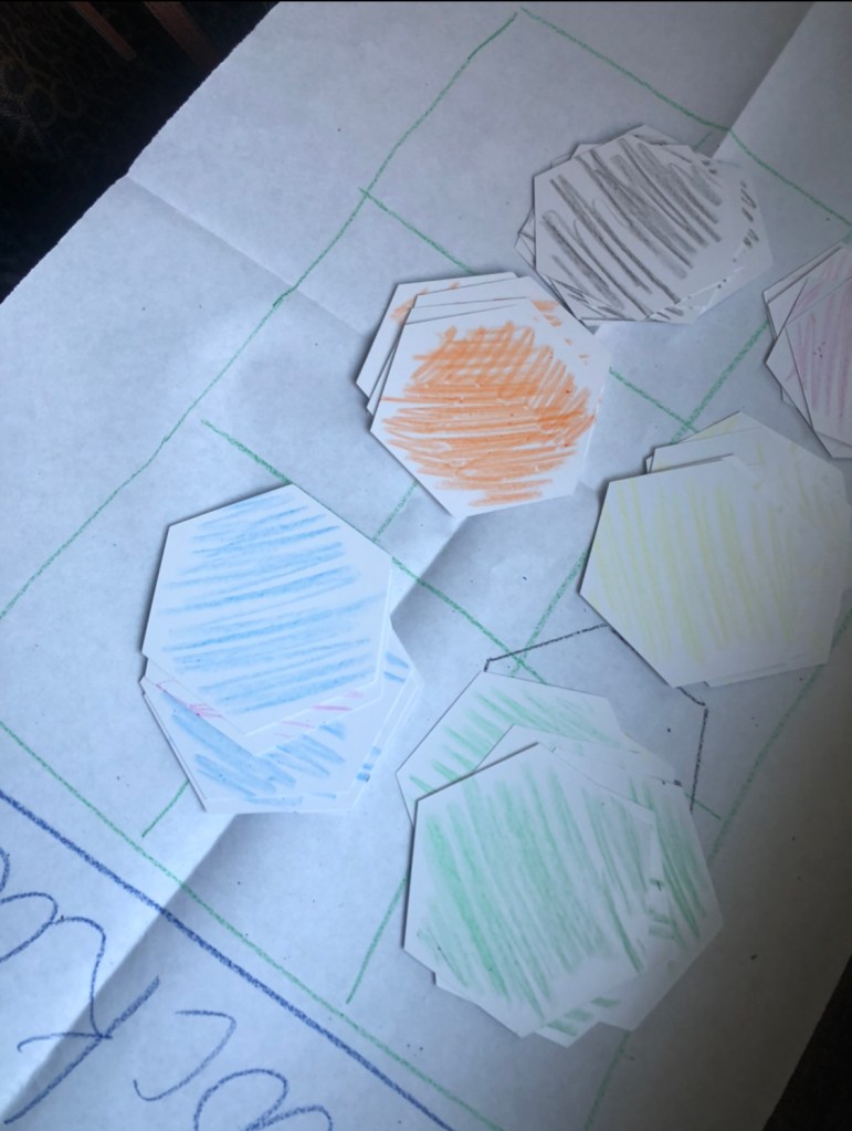 Session 3: In this session, we started out by playing the game with the same rules. And then to make the game a bit more challenging we included the ‘blocks’. Whenever you are going to place in your hexagon, you need to be sure to not put it on a block. AVOID BLOCKS. Once we implemented this, the game seemed fun to play.