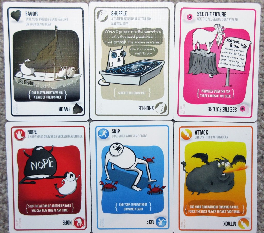 We began our game by distributing the defuse cards, and gave each player a defuse card. After that the deck was shuffled, and we gave everyone seven cards to start the game with. Now the remaining defuse cards were put in the deck, and shuffled again. Once the cards were dealt, I couldn’t help but laugh at the different types of weird cards.